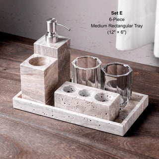Luxury Bathroom Counter Beige Travertine Stone Organizer Set | Spa-Inspired Toiletries Tray, Liquid Soap Dispenser & Tumbler Set