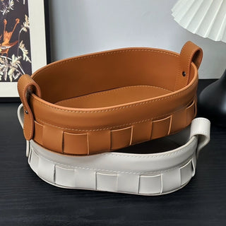 Oval Woven Leather Storage Caddy | Equestrian Tan Valet Tray | for Keys, Cosmetics, and Remotes