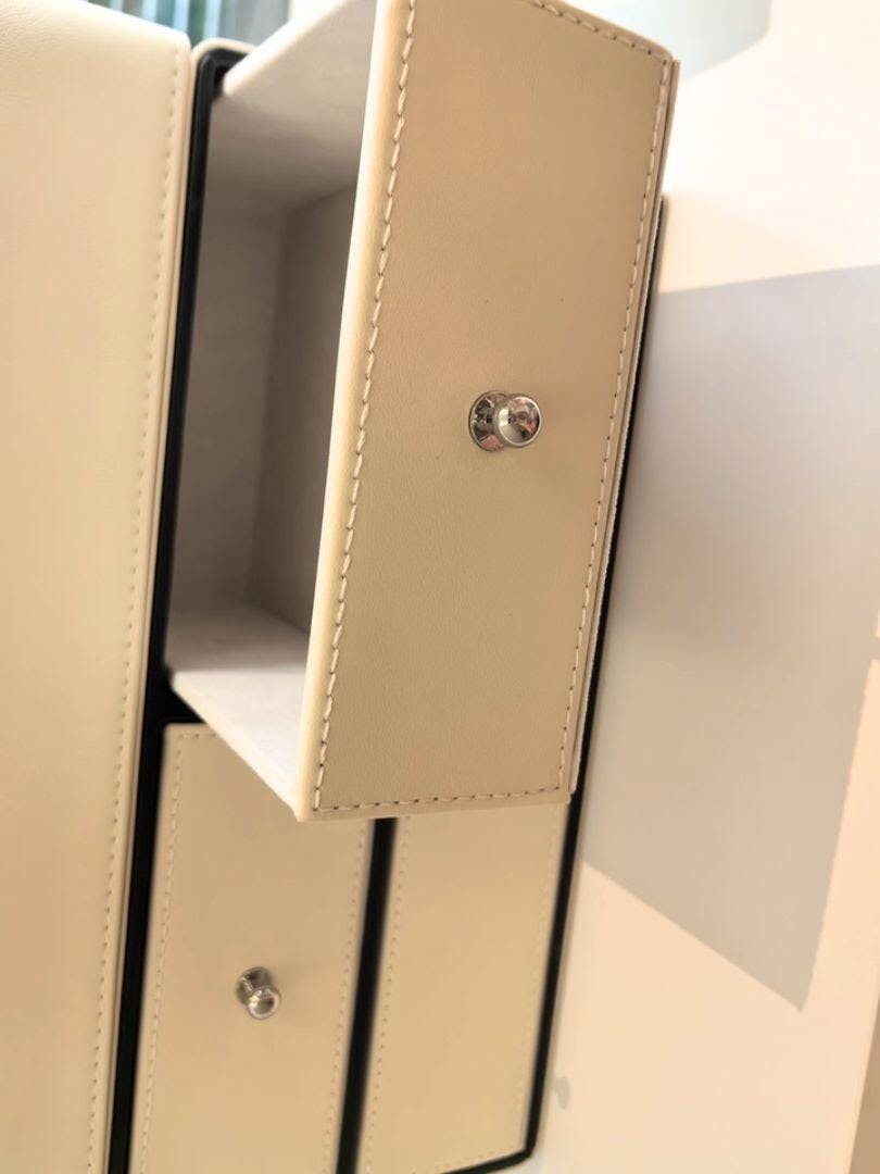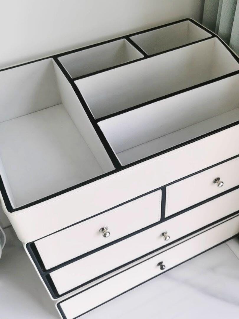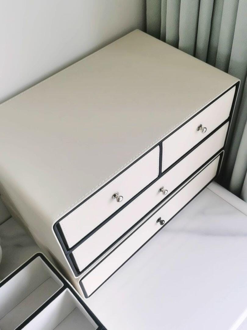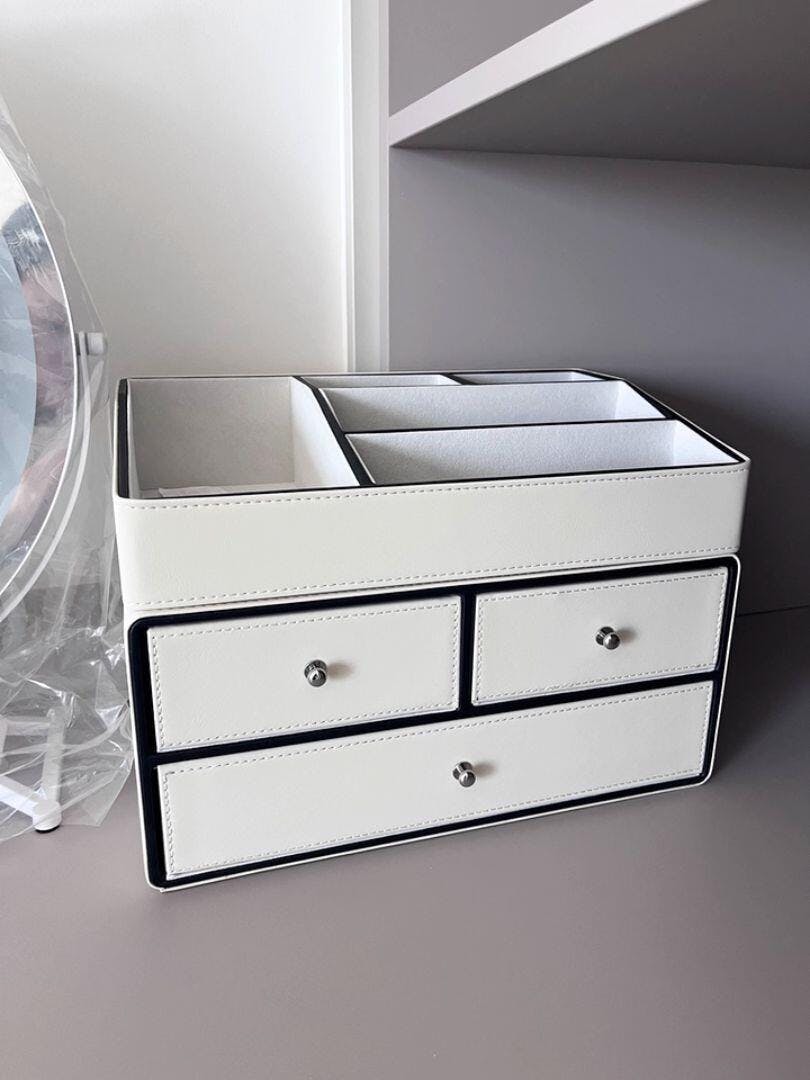 Organize your beauty essentials in exquisite style with our Chic Cream Leather Makeup Organizer. This multi-tier cosmetic storage box is crafted from luxurious cream-toned leather with refined black trim, offering a sophisticated solution for all your makeup, skincare, and jewelry. Featuring multiple drawers and a spacious top compartment, it provides ample storage while keeping your vanity clutter-free and chic. A perfect blend of elegance and functionality for any dressing table, bathroom, or bedroom.