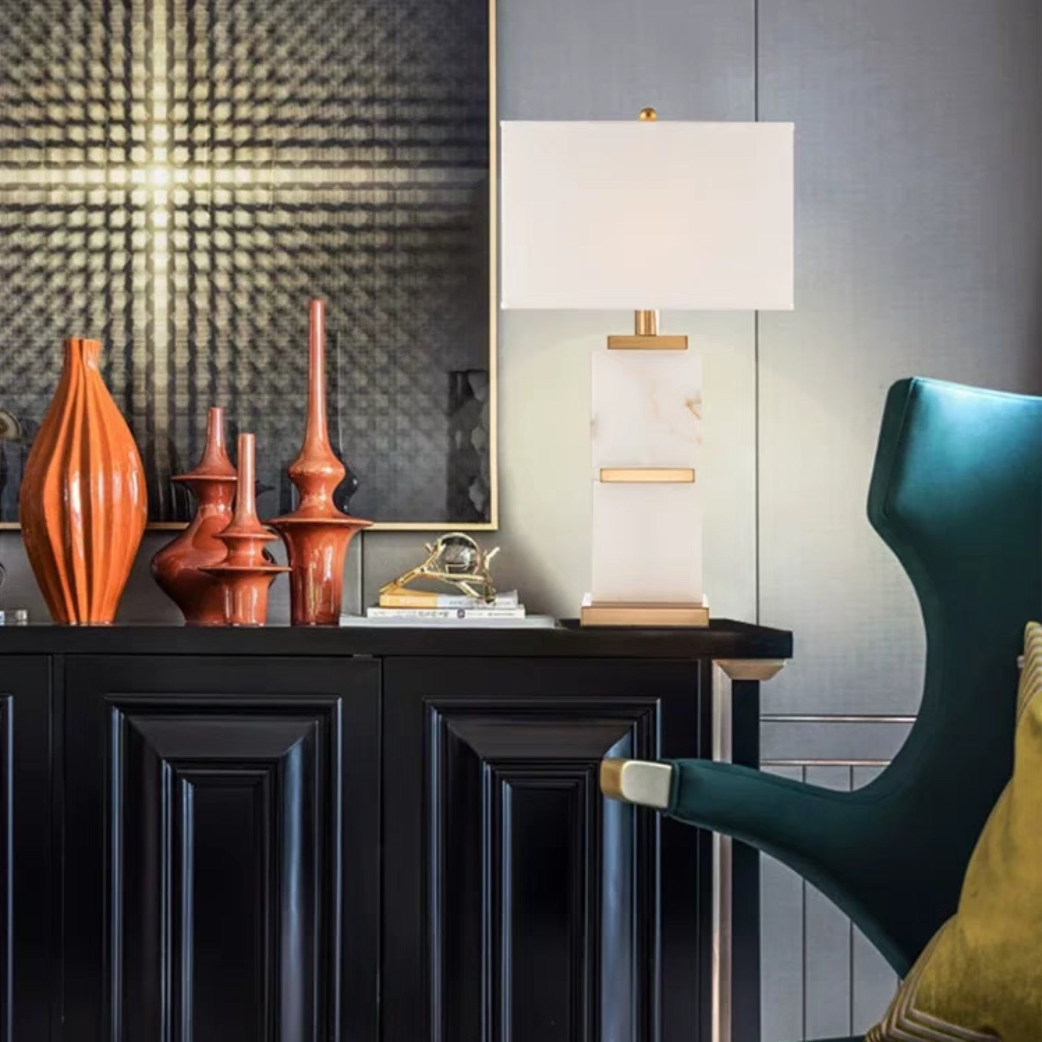 An architectural statement of refined luxury. The Lyra lamp features two solid blocks of natural white marble, elegantly separated by a gilded divider. This geometric, layered design creates a captivating play of light and shadow, offering a sophisticated focal point for any upscale living room or entryway.
