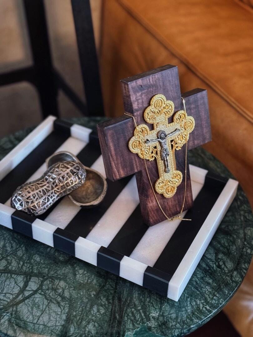 Crafted from contrasting pieces of polished black and white stones, meticulously inlaid to create a flawless, linear pattern. An elegant Parisian organizer for consoles, vanities, or desks. Substantial, polished, and impeccably tailored to elevate daily essentials.