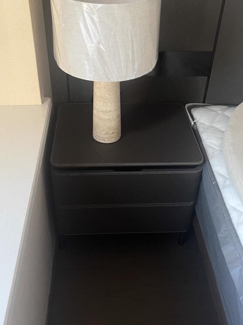 Raised on slim metal legs, this Milan nightstand keeps the look light while making floor cleaning a breeze. The leather‑wrapped body and rounded corners soften the profile; two drawers organize everything from tech to reading glasses.