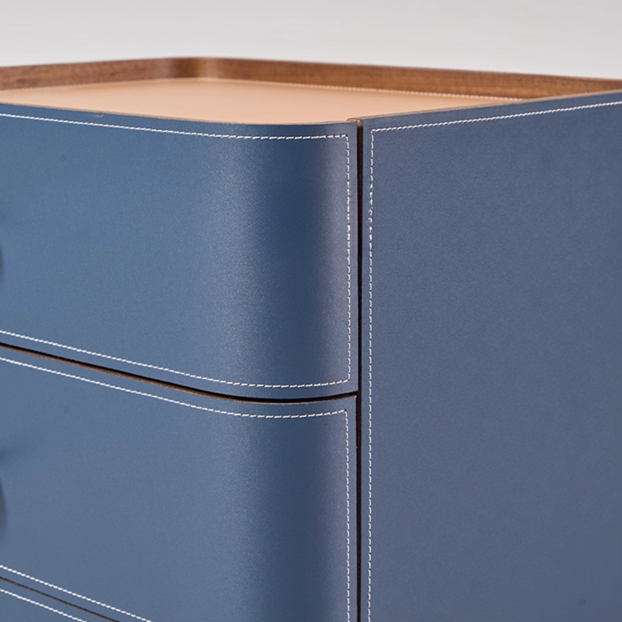Make a statement with Portofino’s deep navy tone and clean Italian minimalism. Fully leather‑wrapped—including the top surface—this three‑drawer nightstand delivers generous storage and a luxe feel that pairs beautifully with crisp bedding and modern lighting.