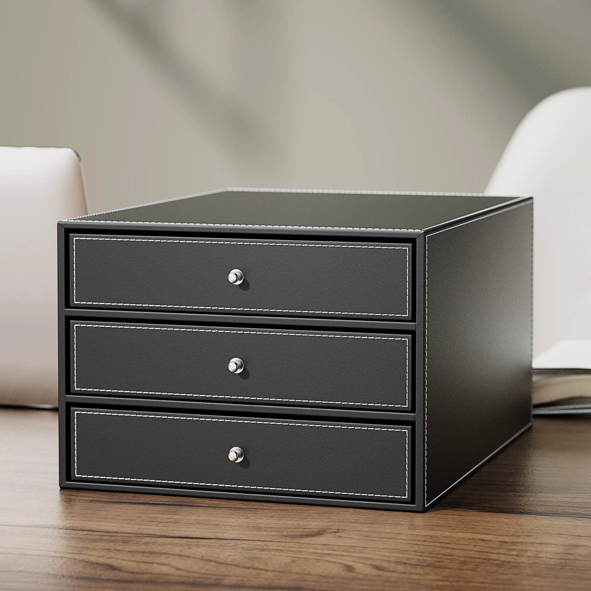 Conceal clutter and secure essentials with this elegant 3-drawer storage chest. Covered entirely in textured leatherette, the piece features polished knobs, offering discreet yet substantial organization for accessories, paperwork, and valuables. An essential piece for high-end organization. Ideal for executive suites, reception, and hospitality desks.