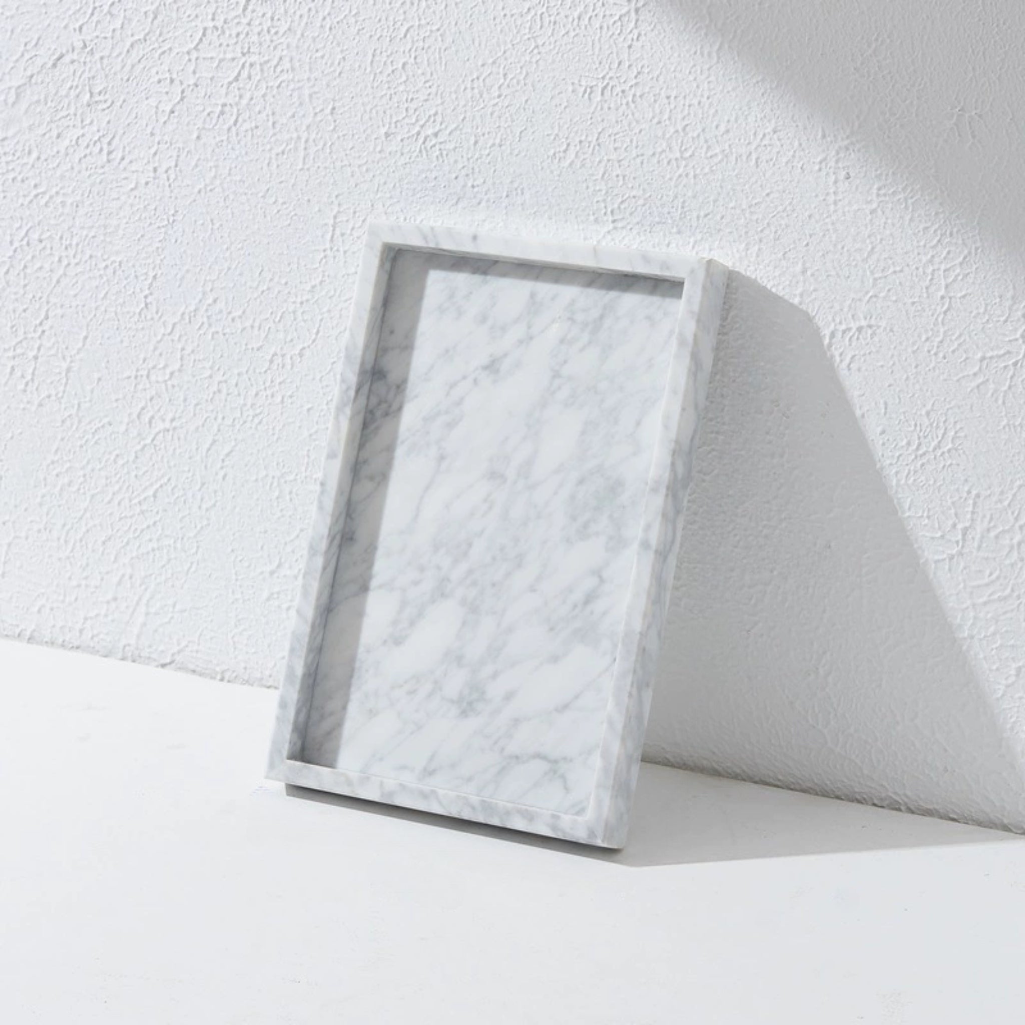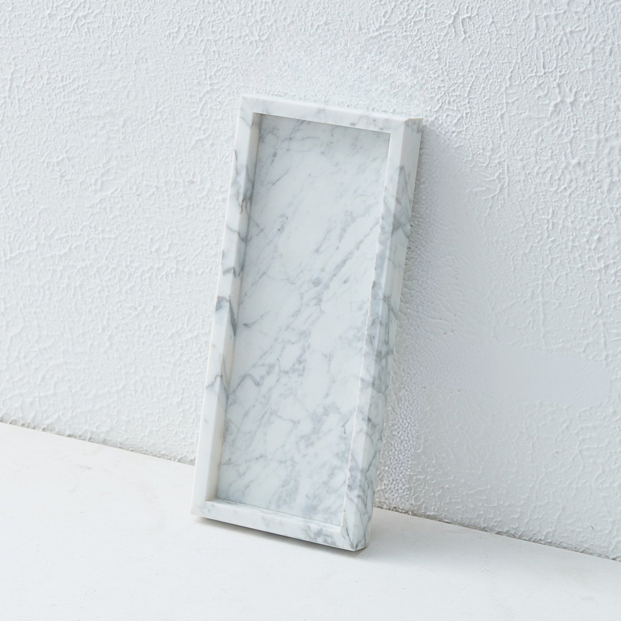A timeless piece, honed from classic Bianco Carrara marble. The minimalist, rectangular form highlights the pristine white surface and subtle grey veining. An essential element of sophisticated organization.