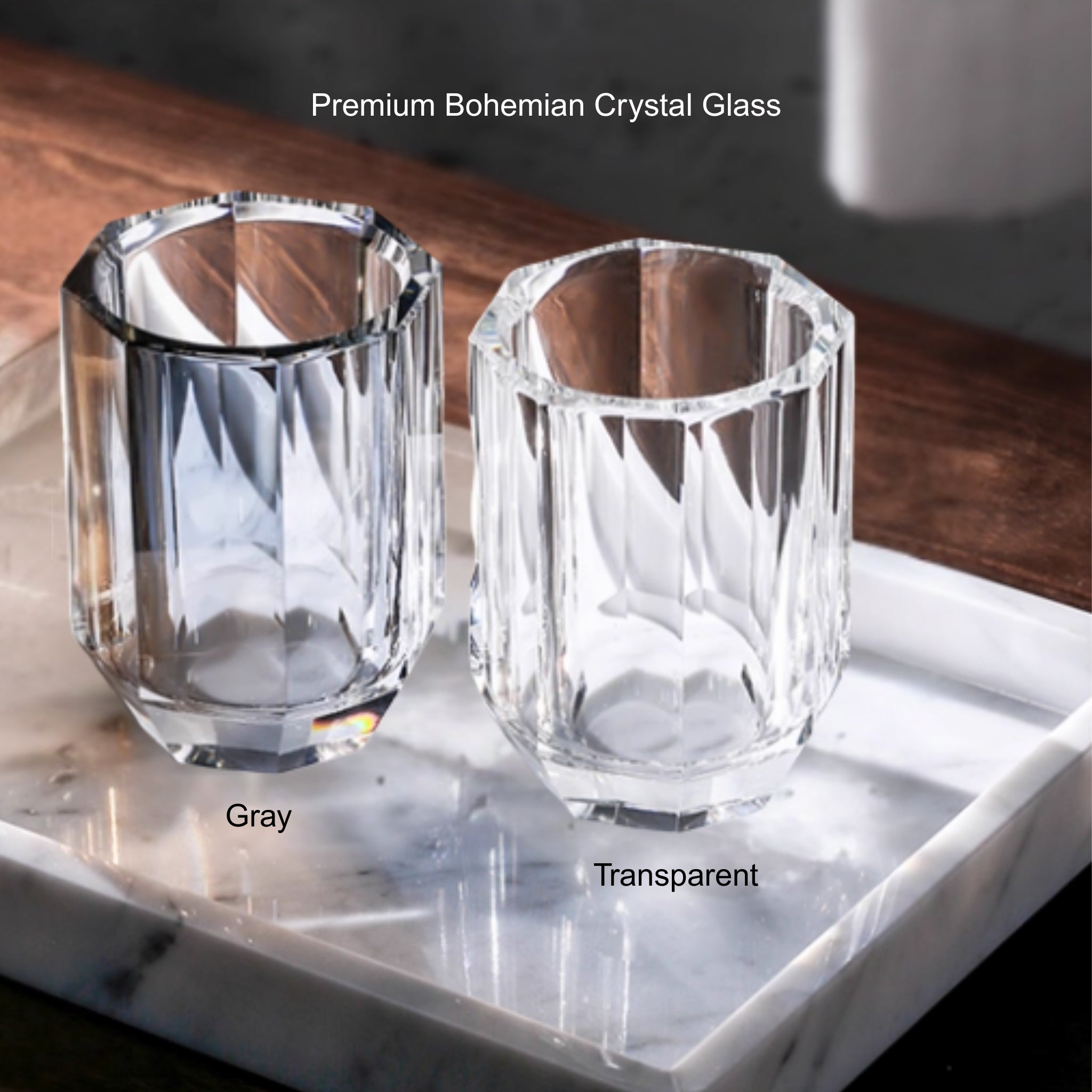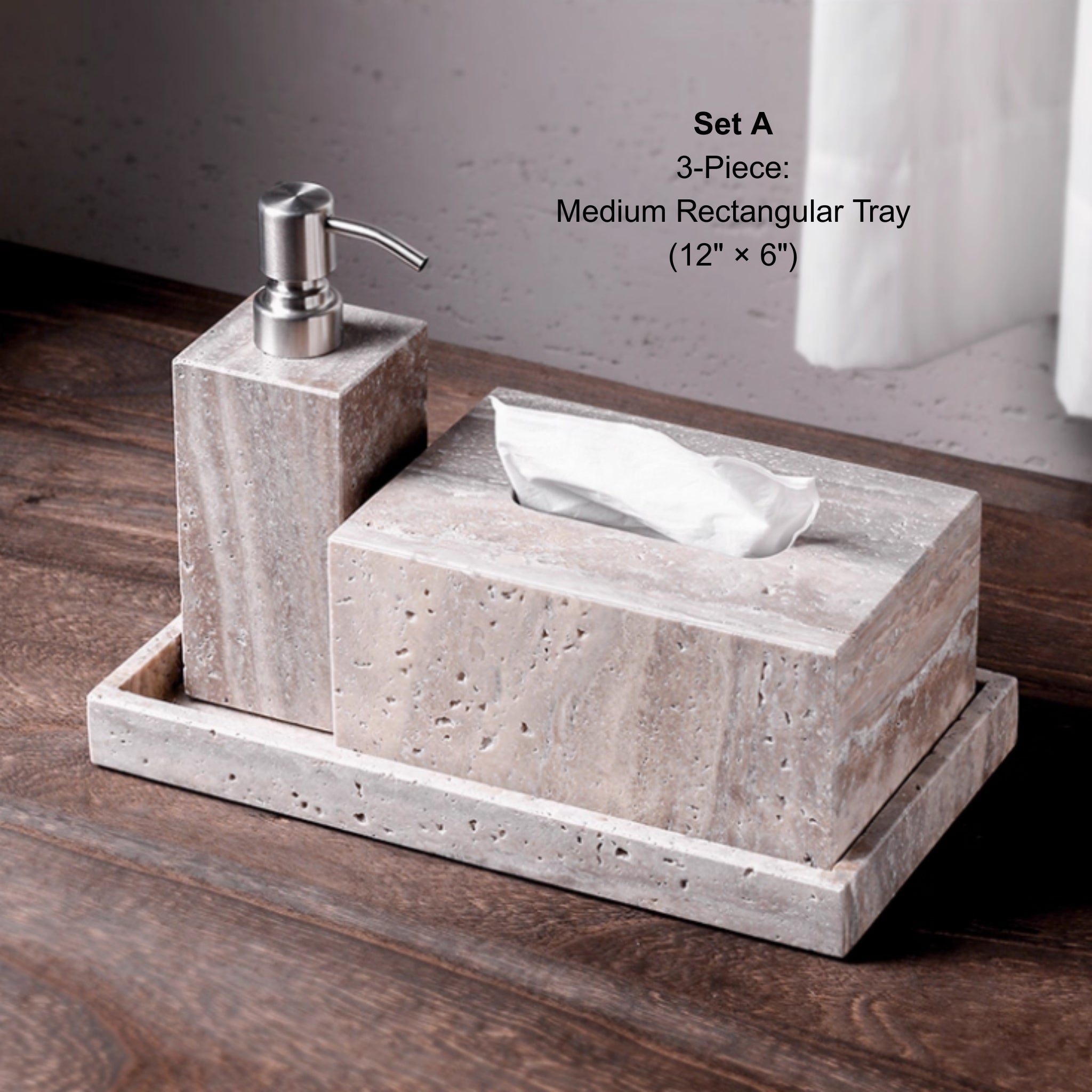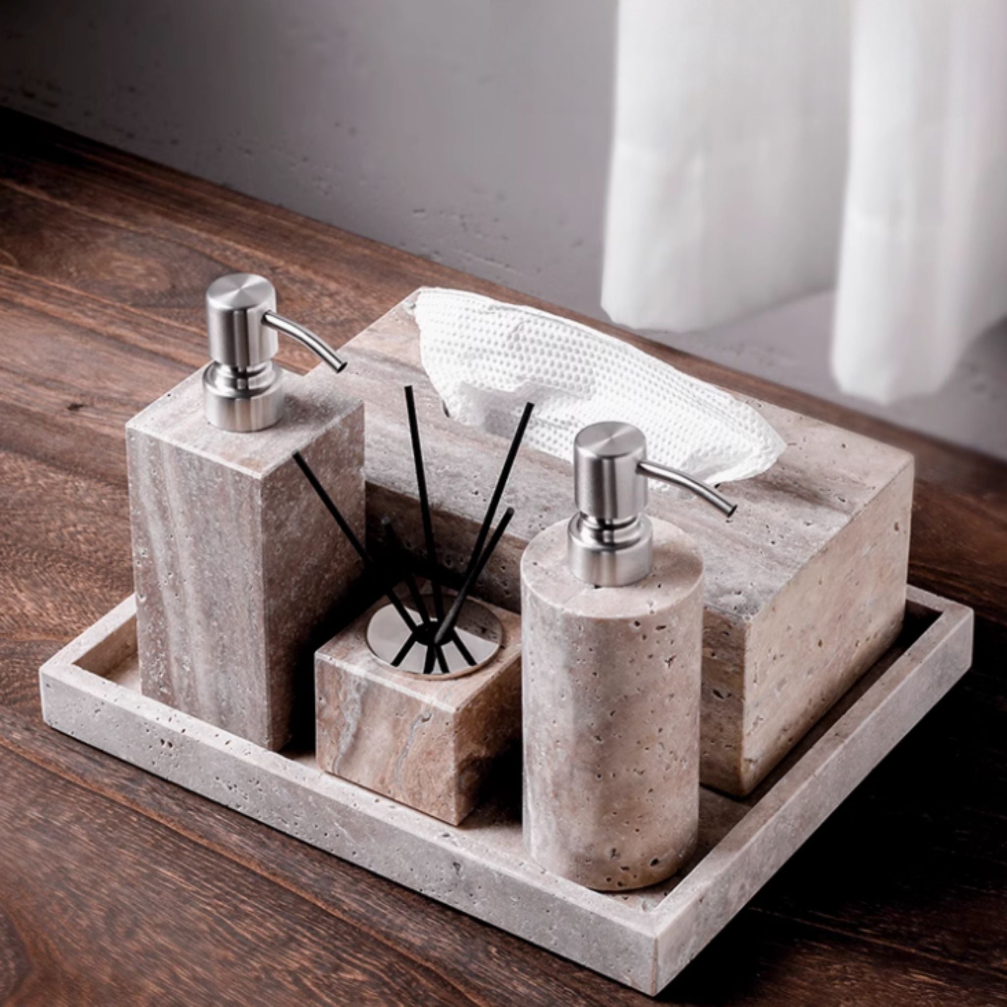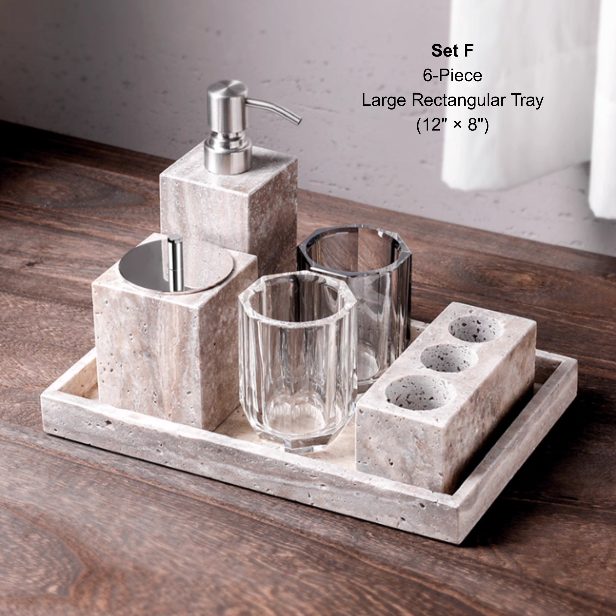 - Pieces: tray, soap dispenser, tumbler, toothbrush holder, and lidded jar