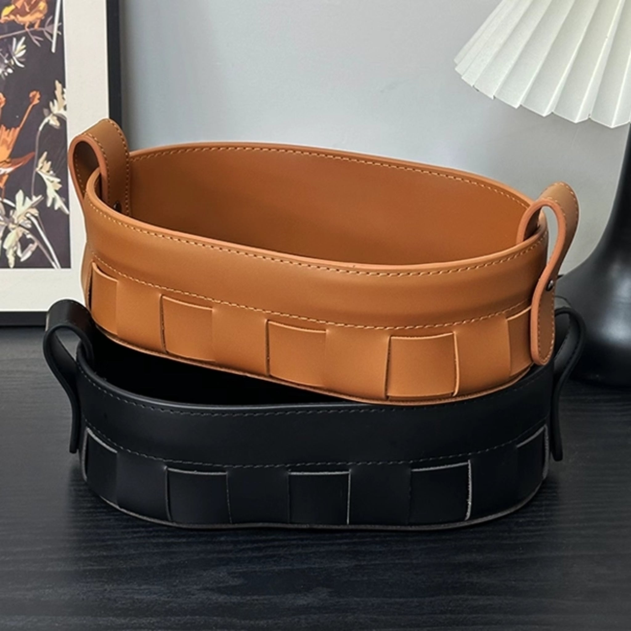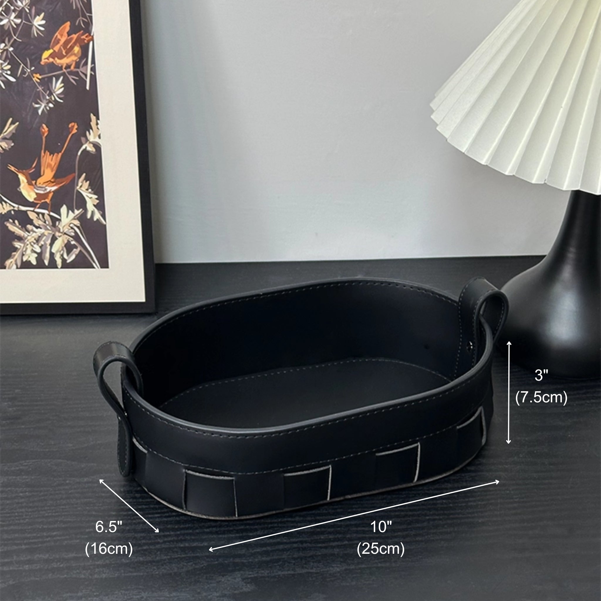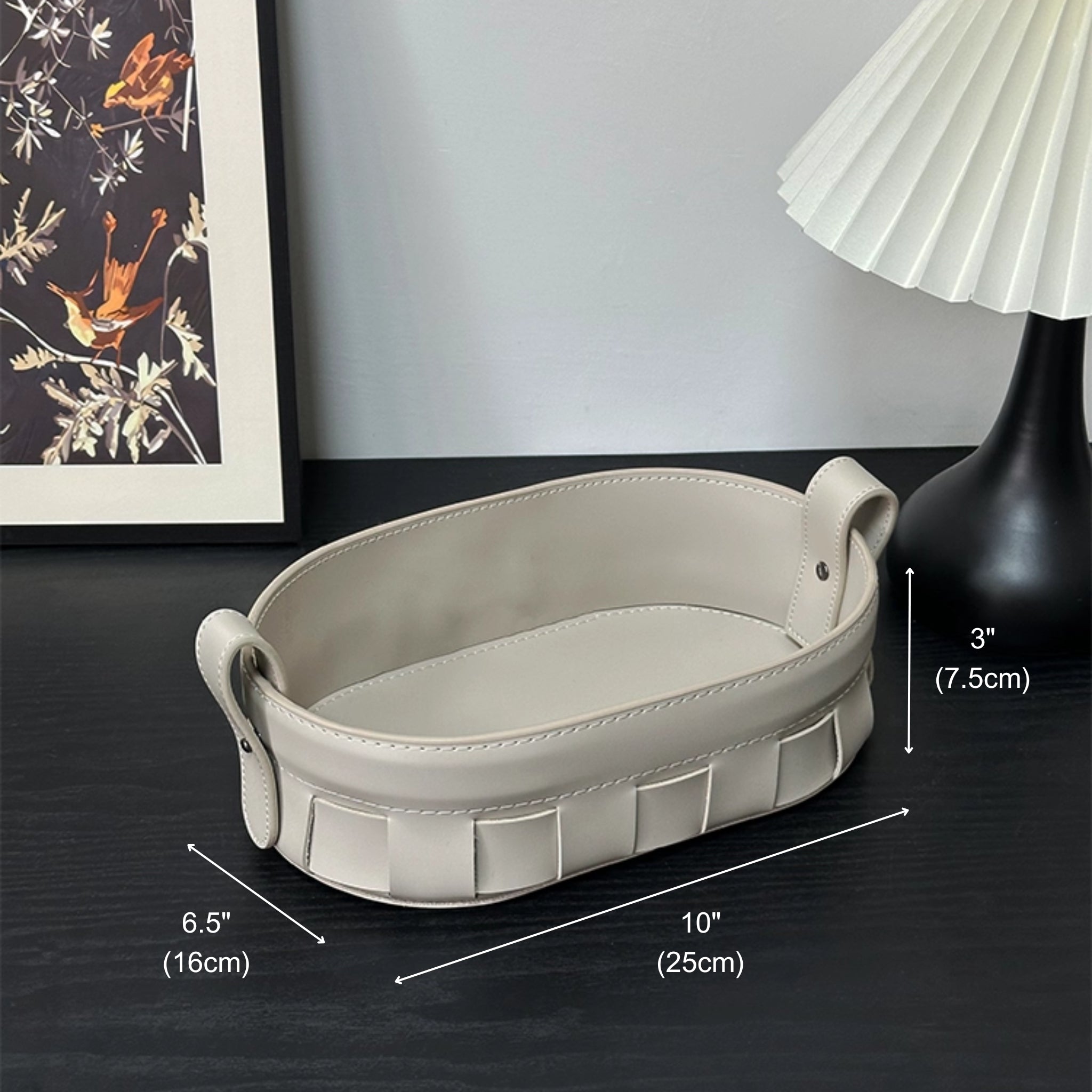 This elongated oval caddy features a textured woven leather body, smooth trim, and rounded handles. Your go-to catchall for coffee tables, vanities, entry consoles, or bedside storage.