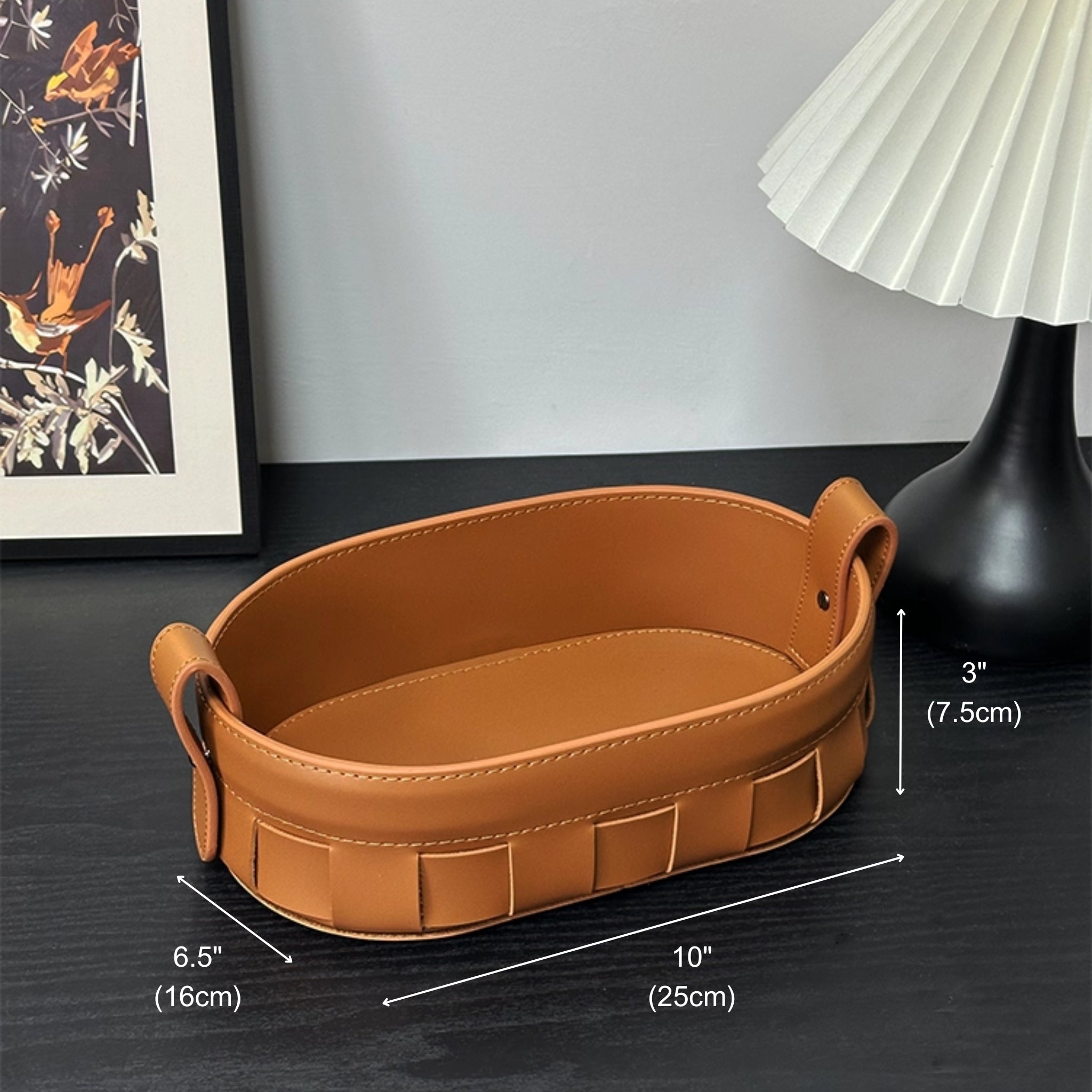 Oval Woven Leather Storage Caddy | Equestrian Tan Valet Tray | for Keys, Cosmetics, and Remotes