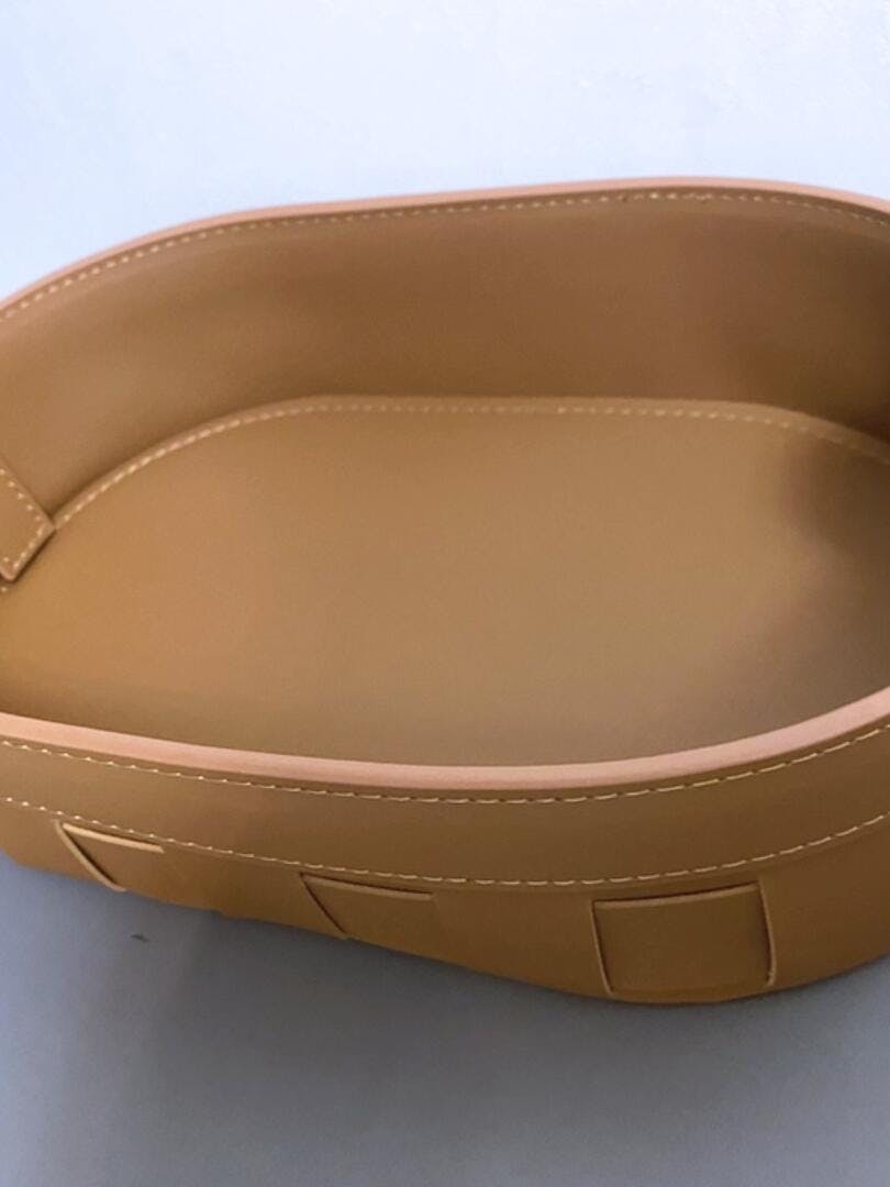 This elongated oval caddy features a textured woven leather body, smooth trim, and rounded handles. Your go-to catchall for coffee tables, vanities, entry consoles, or bedside storage.