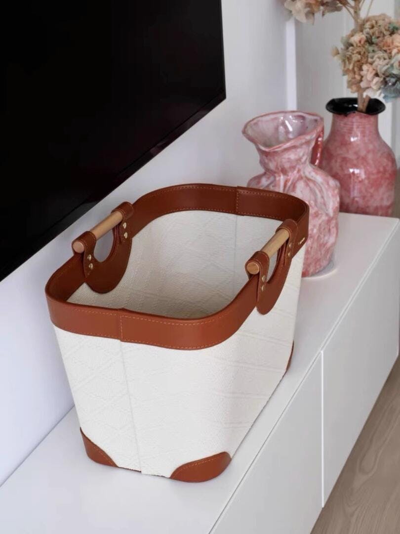 Designed for stylish organization on consoles, coffee tables, and kitchen counters. The oval silhouette showcases woven leather panels, smooth leather edging, and warm wood handles for an elevated, mixed‑material look.