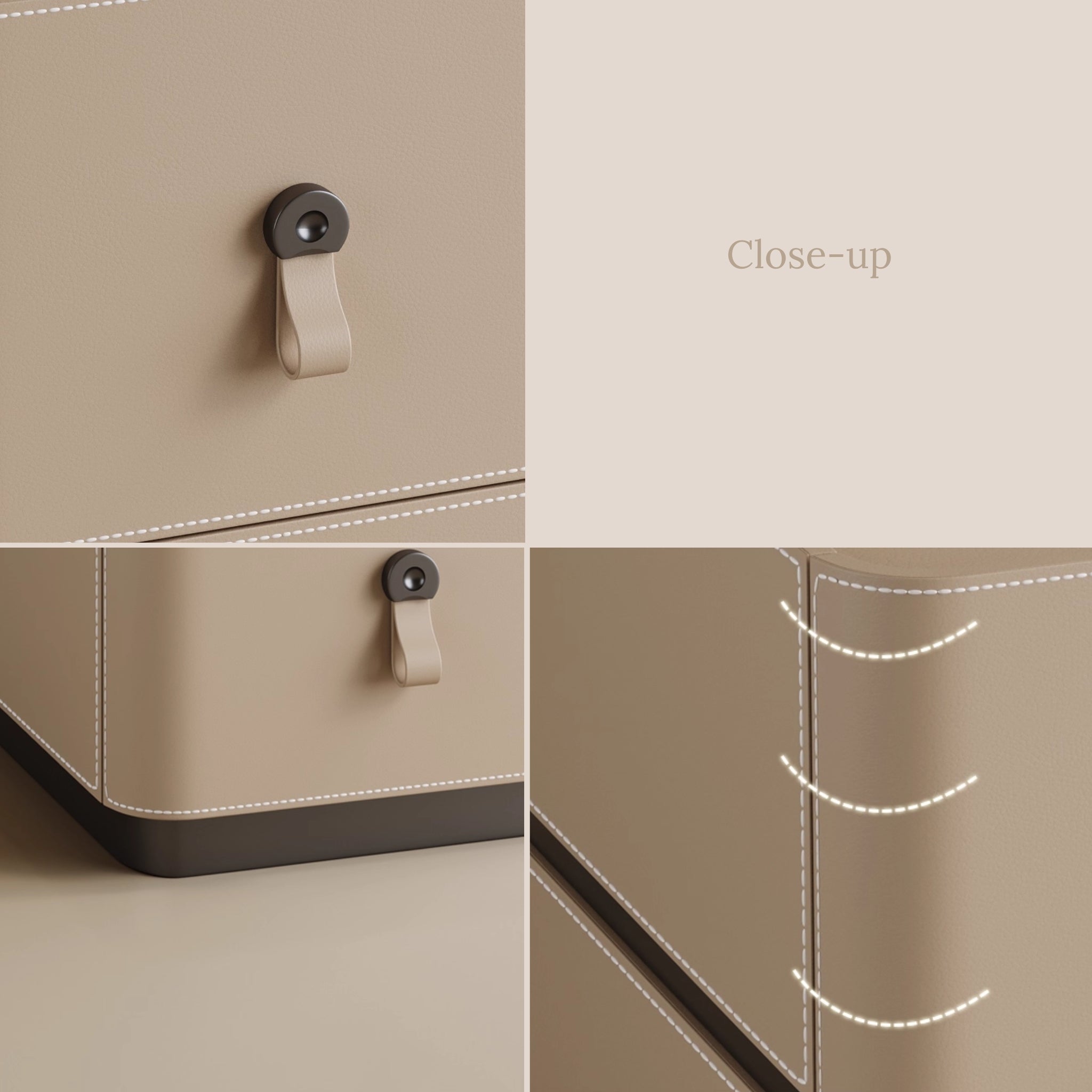 The Slim Milan stacks two drawers in a narrow footprint and finishes the case in leather with stitched loop pulls. Just right for studio bedrooms, reading nooks, or as a pair on smaller beds.